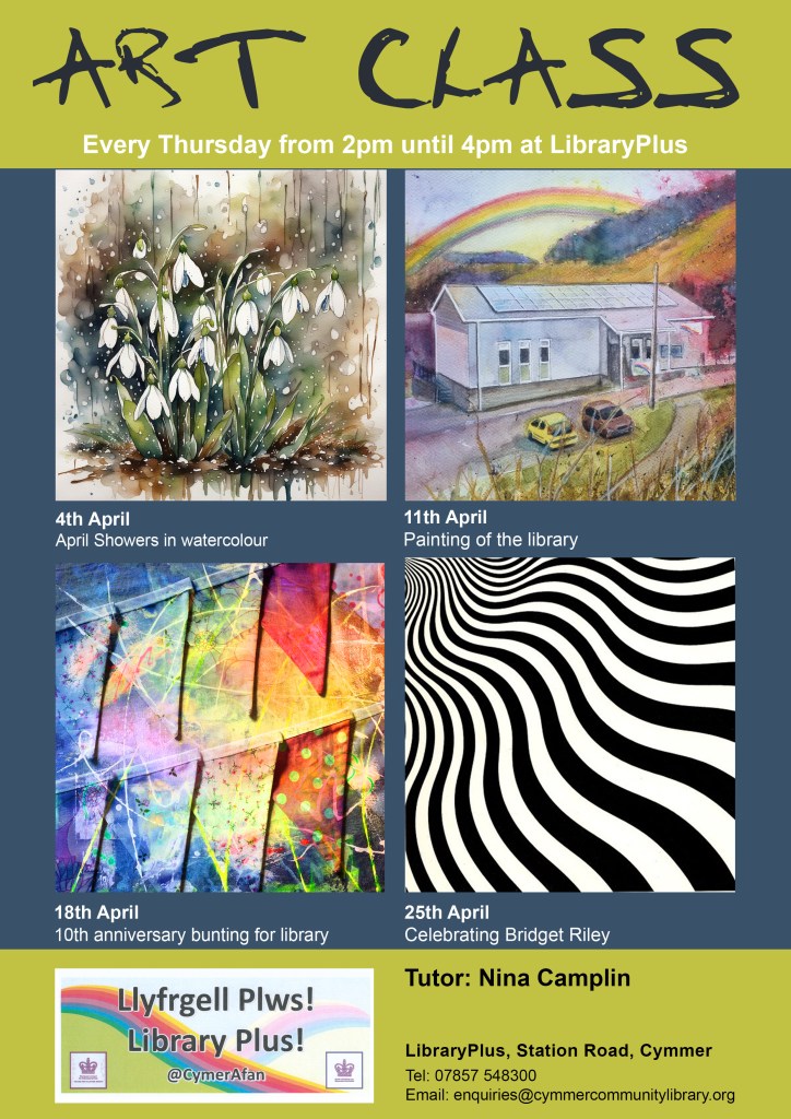 Programme of Art Classes at LibraryPlus, Cymmer for April.