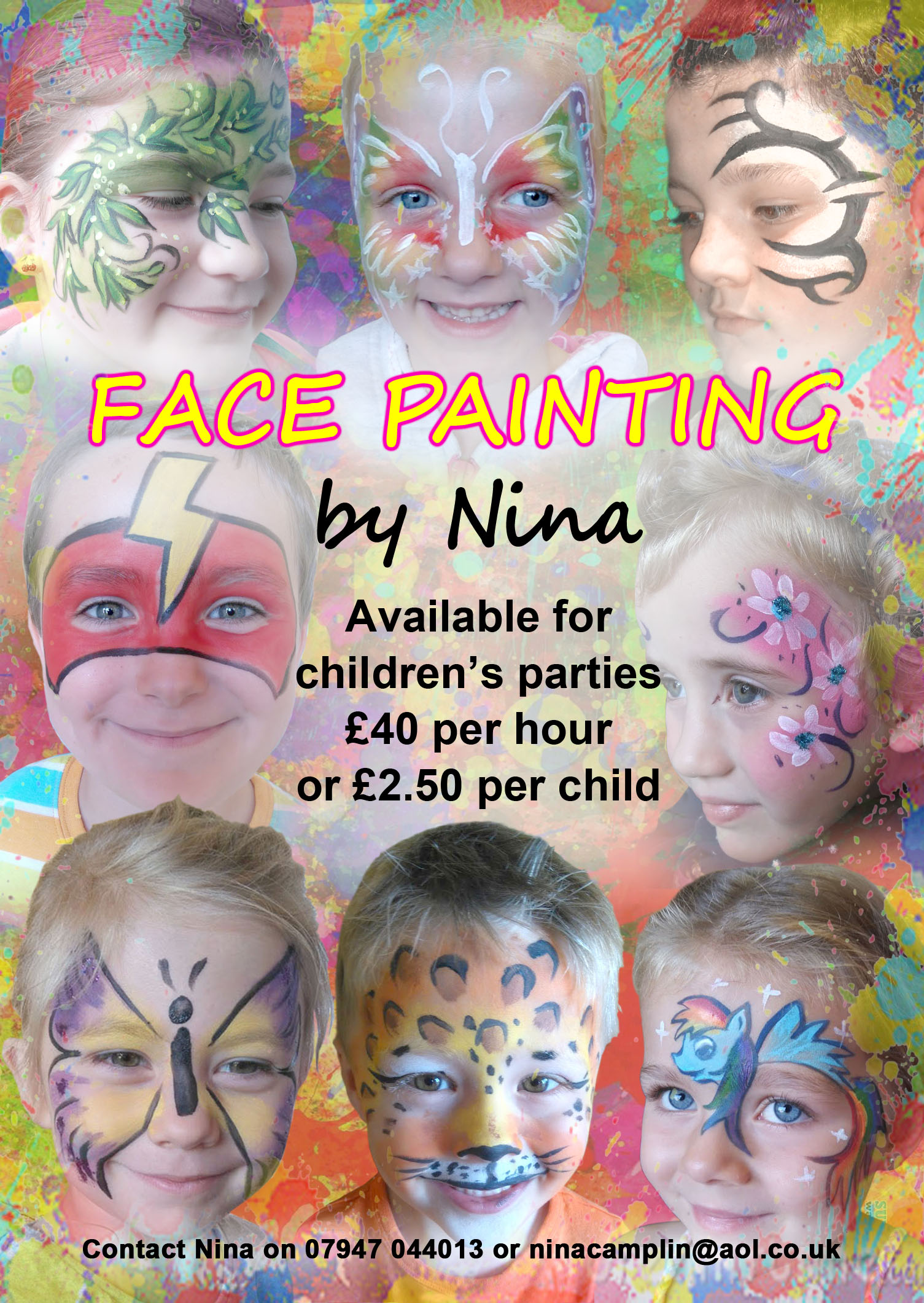 Face Painting Starts at £40 per hour, price will go down if booked for more than 1 hour. Alternative price £2.50 per child with a minimum of 10 faces. Call me on 07947 044013 or email me at ninacamplin@aol.co.uk ADULTS ALSO CATERED FOR… Share this: Click to share on X (Opens in new window) X Click to share on Facebook (Opens in new window) Facebook Like Loading...