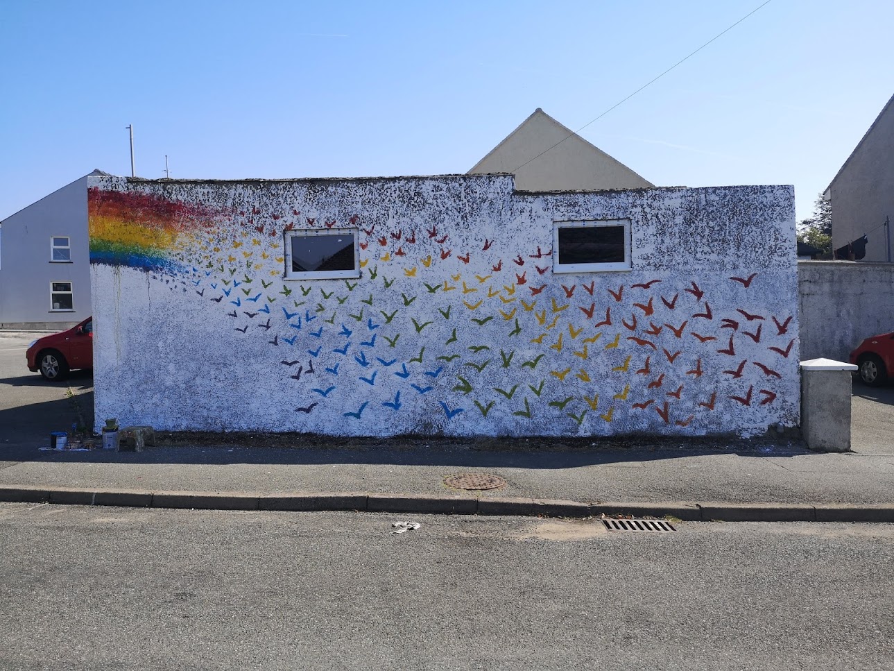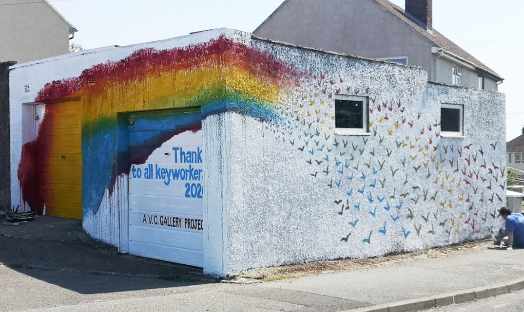 The rainbow was a symbol of lockdown, as it turns the corner it begins to break up and becomes a flock of birds to represent getting our freedom back.